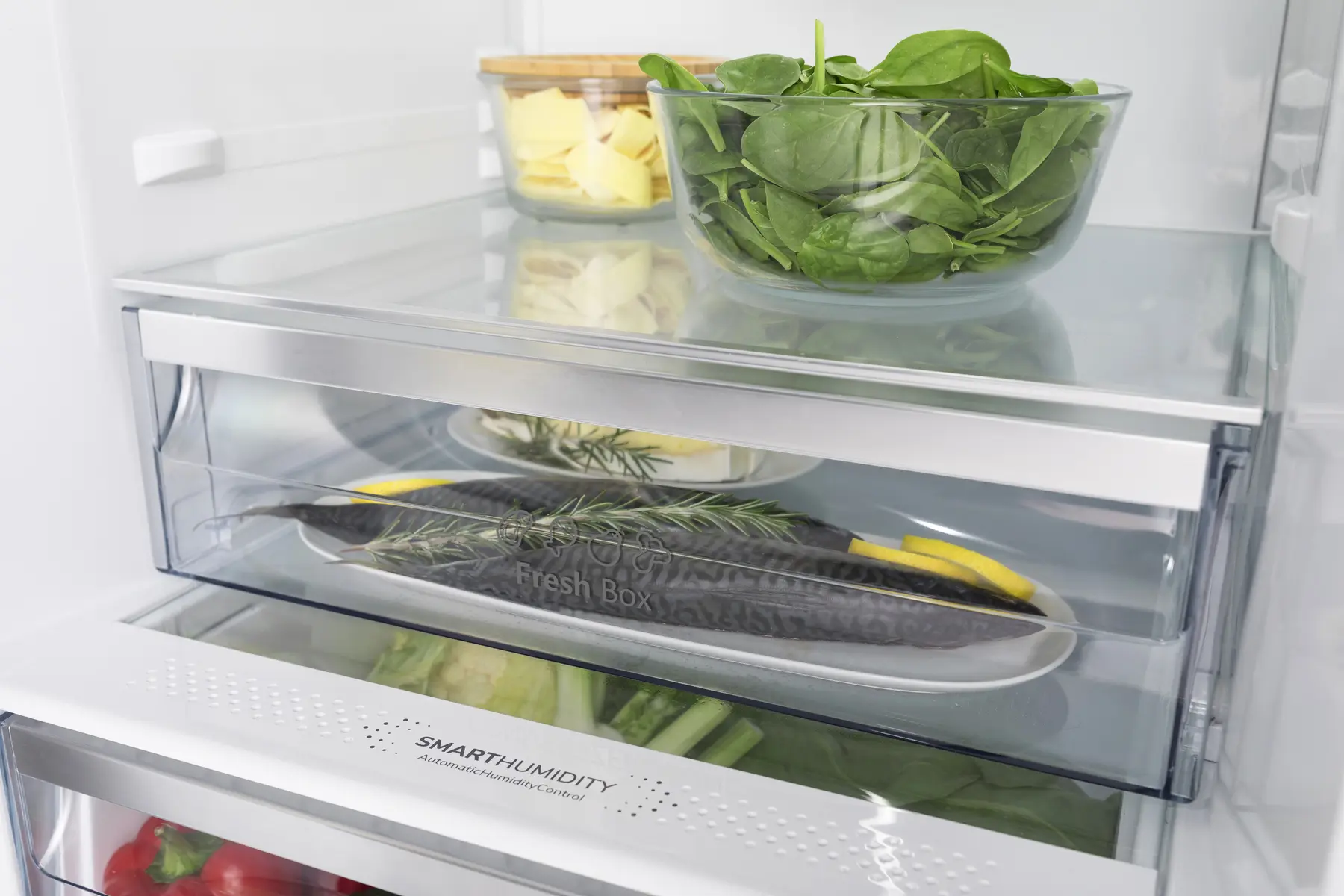 Ce réfrigérateur est top , grand . 2 grands bacs à légumes et 1 bac pour la viande.