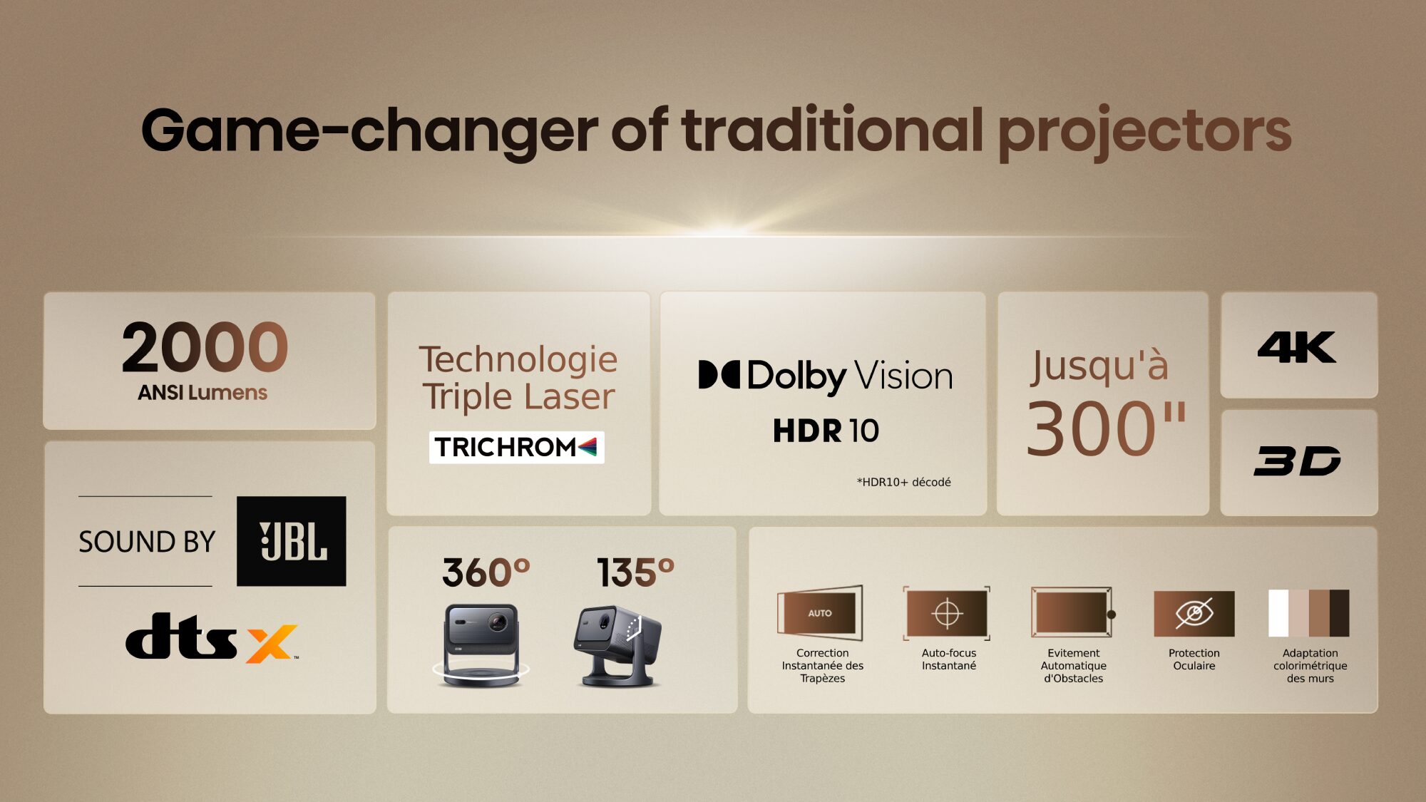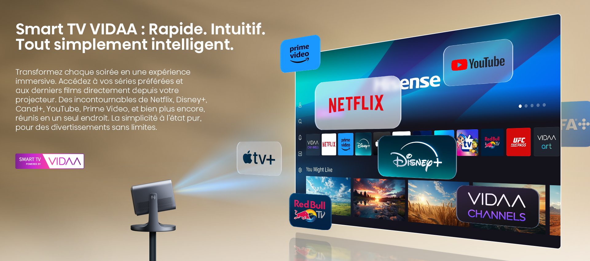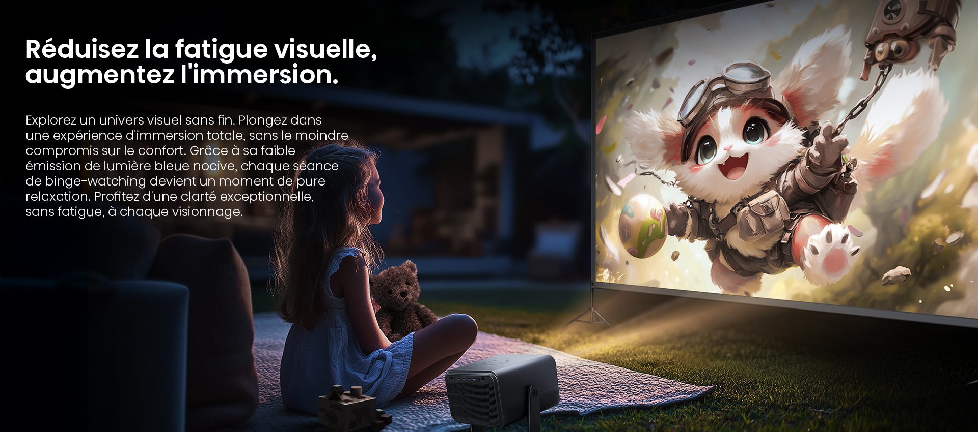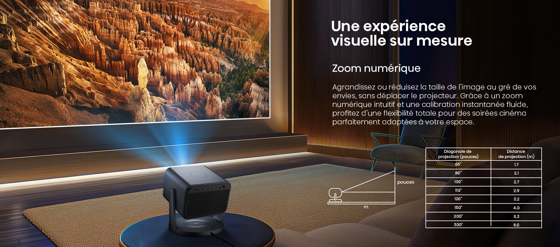 Avec sa fonction 3D, plongez dans une nouvelle dimension de réalisme pour vos contenus préférés. La focale ajustable permet une projection flexible de 65'' à 300'', s'adaptant à tous vos espaces, tandis que le zoom numérique assure une mise au point personnalisée.