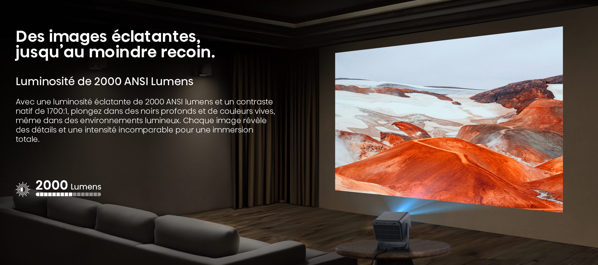 Le Laser Mini Projecteur C2 transforme votre maison en une véritable salle de cinéma. Grâce à sa luminosité de 2000 lumens ANSI et à sa résolution 4K Ultra HD, profitez d'images nettes, lumineuses et détaillées, idéales pour des soirées cinéma ou des événements spéciaux.