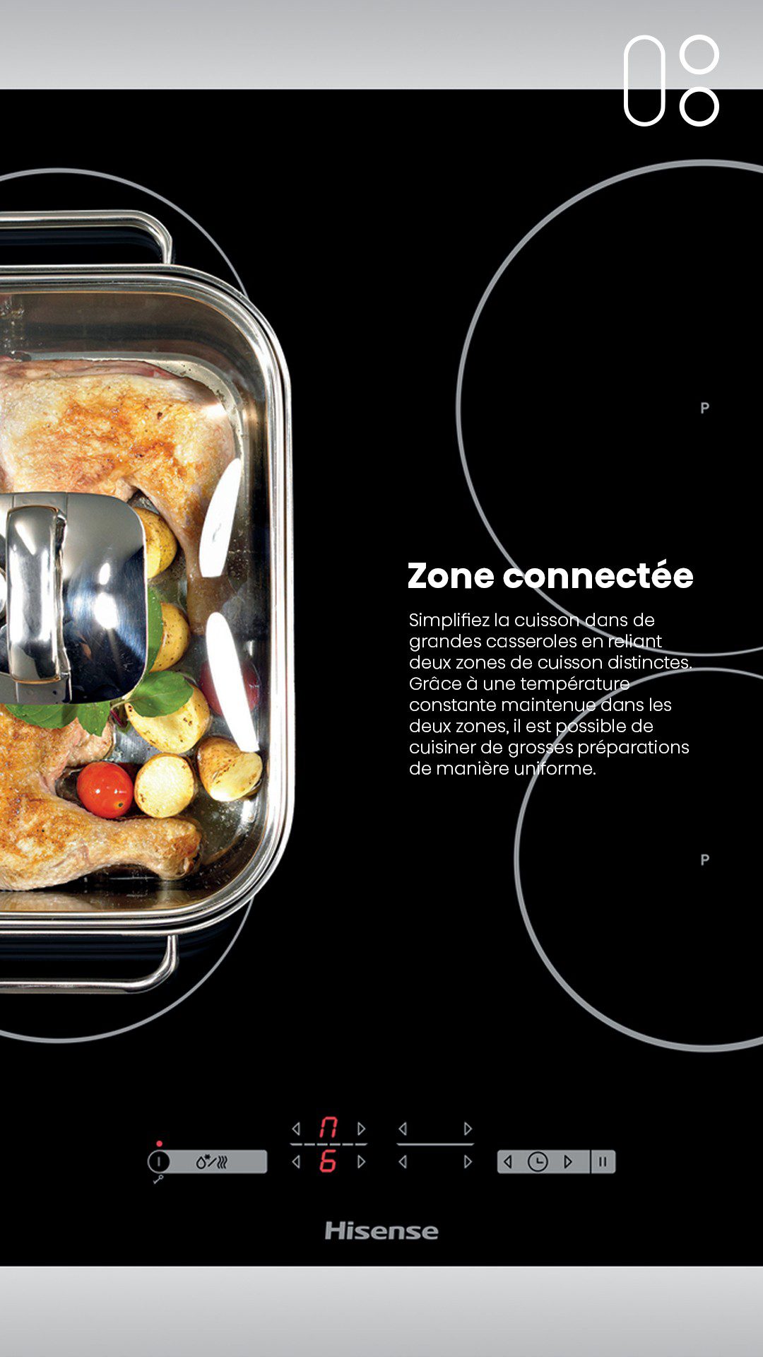 Simplifiez la cuisson dans de grandes casseroles en reliant deux zones de cuisson distinctes. Grâce à une température constante maintenue dans les deux zones, il est possible de cuisiner de grosses préparations de manière uniforme.