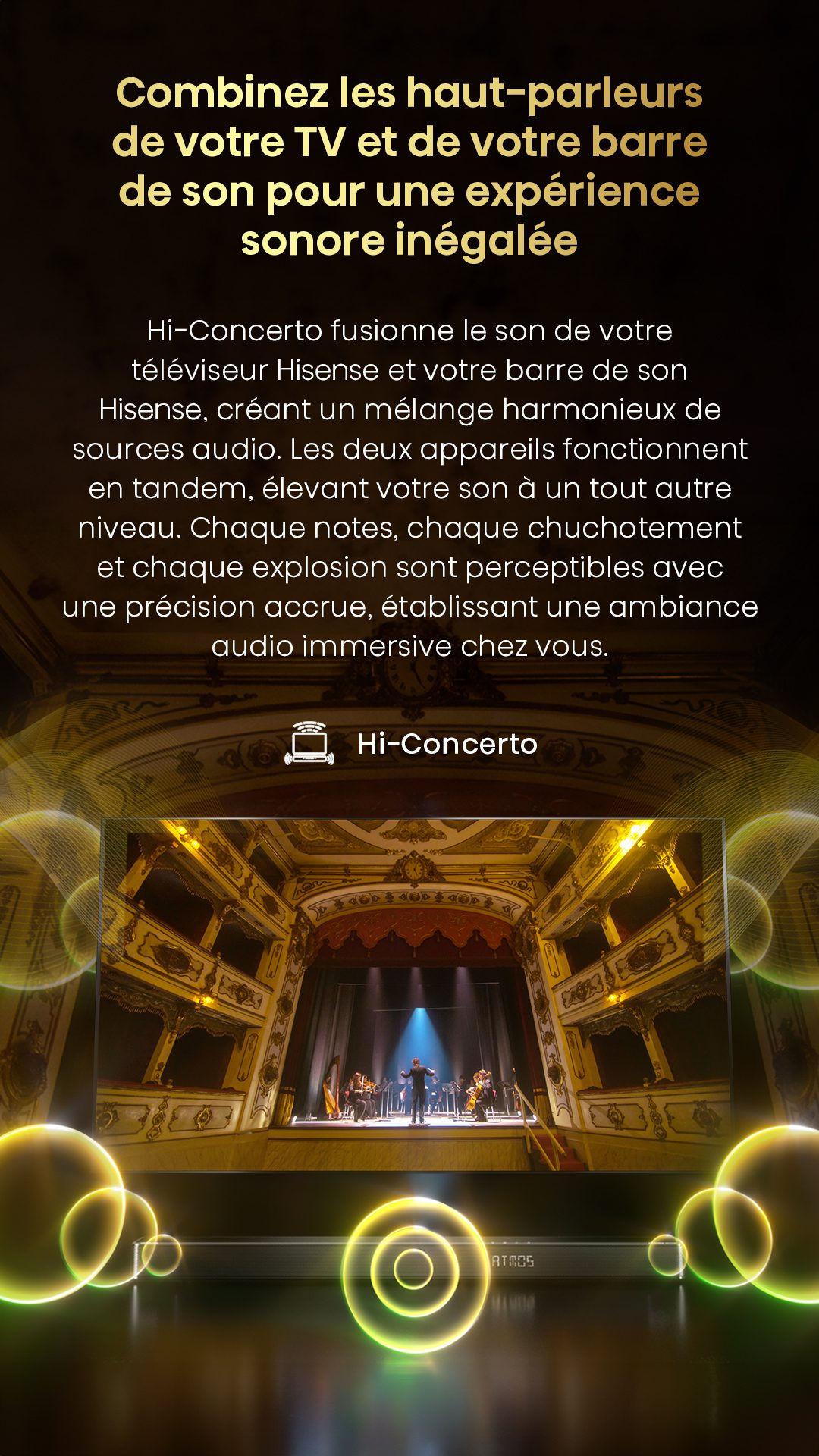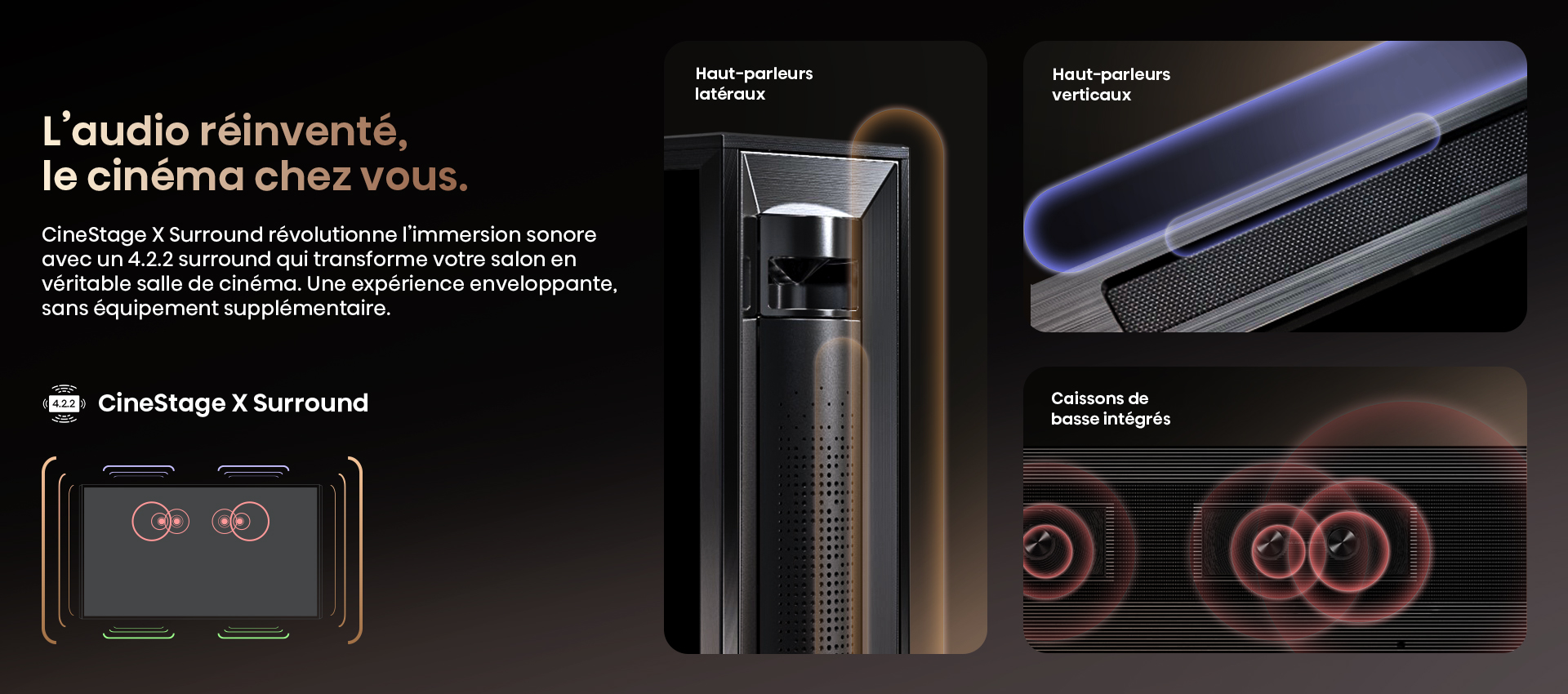 Pour une immersion comme au cinéma, le TV est équipé d'un système sonore 4.2.2 CH , d'une puissance de 94W incroyablement immersif compatible Dolby Atmos et DTS:X.