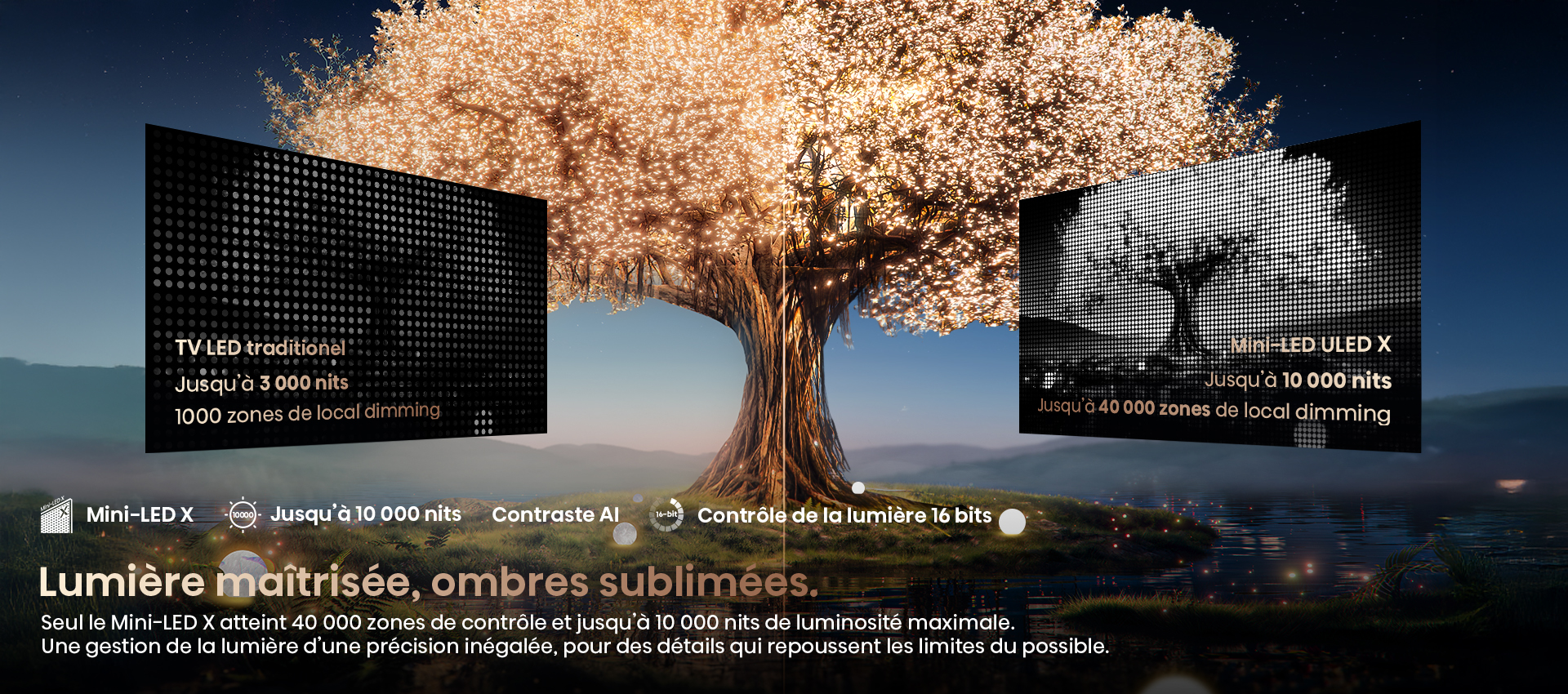 De plus, le rétroéclairage Mini-LED permet d’obtenir des noirs profonds, des contrastes riches et des couleurs éblouissantes. Couplée à une luminosité pouvant atteindre jusqu'à 10 000 nits et à plus de 40 000 zones de Local Dimming, ce Téléviseur vous fait redécouvrir vos films et jeux vidéos préférés dans des conditions idéales, même dans des pièces très lumineuses.