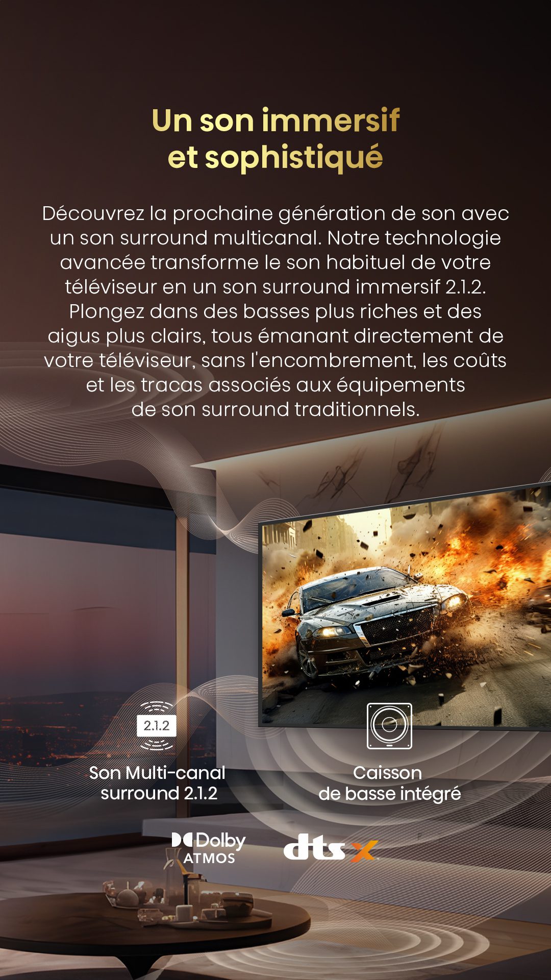 Dolby Atmos transcende l’expérience d’écoute en vous faisant vivre le son de l’intérieur, grâce à une spatialisation sonore qui révèle des détails d’une clarté et d’une profondeur incomparables.