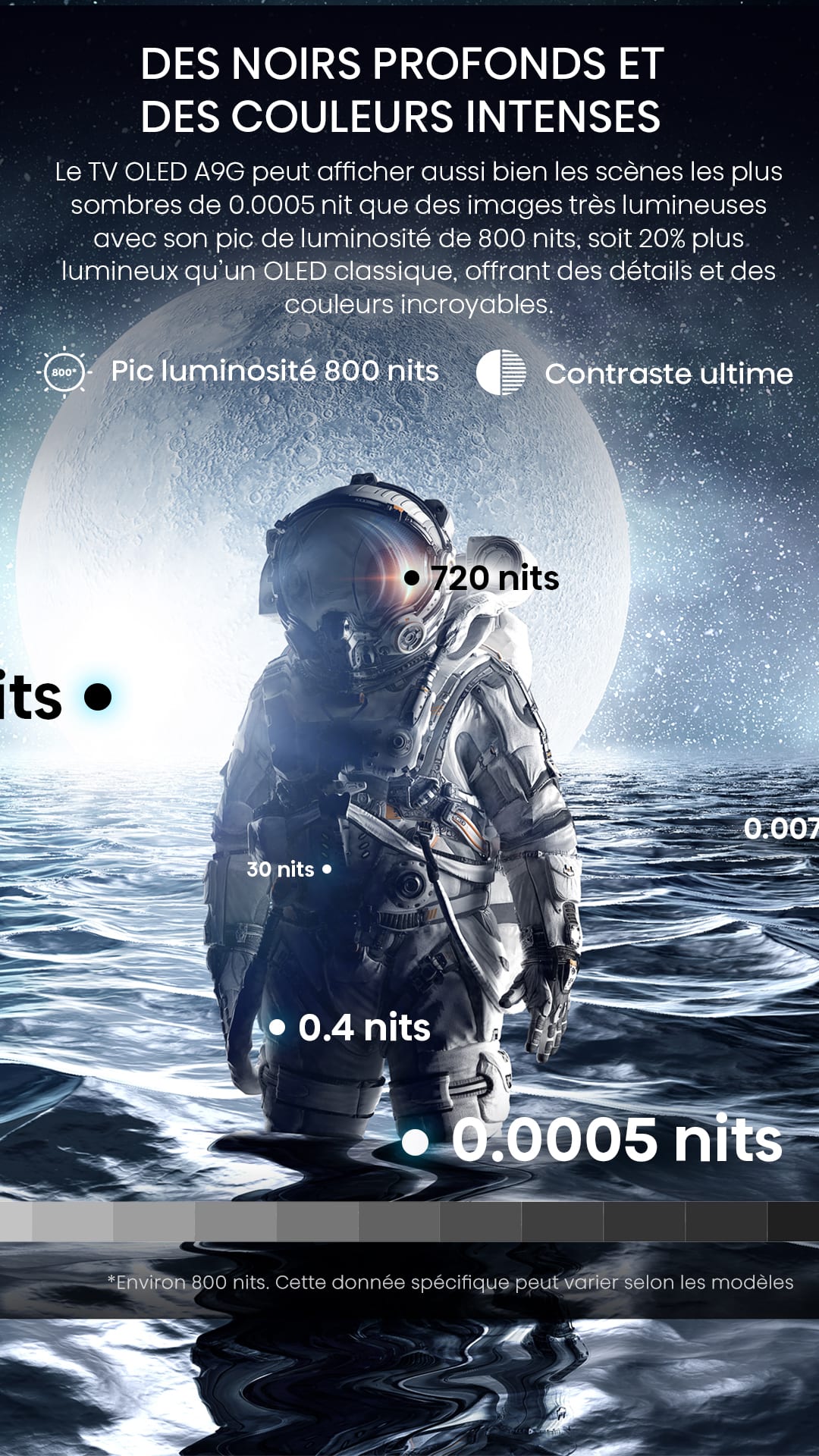 Le TV OLED A9G peut afficher aussi bien les scènes les plus sombres de 0.0005 nit que des images très lumineuses avec son pic de luminosité de 800 nits, soit 20% plus lumineux qu’un OLED classique, offrant des détails et des couleurs incroyables.