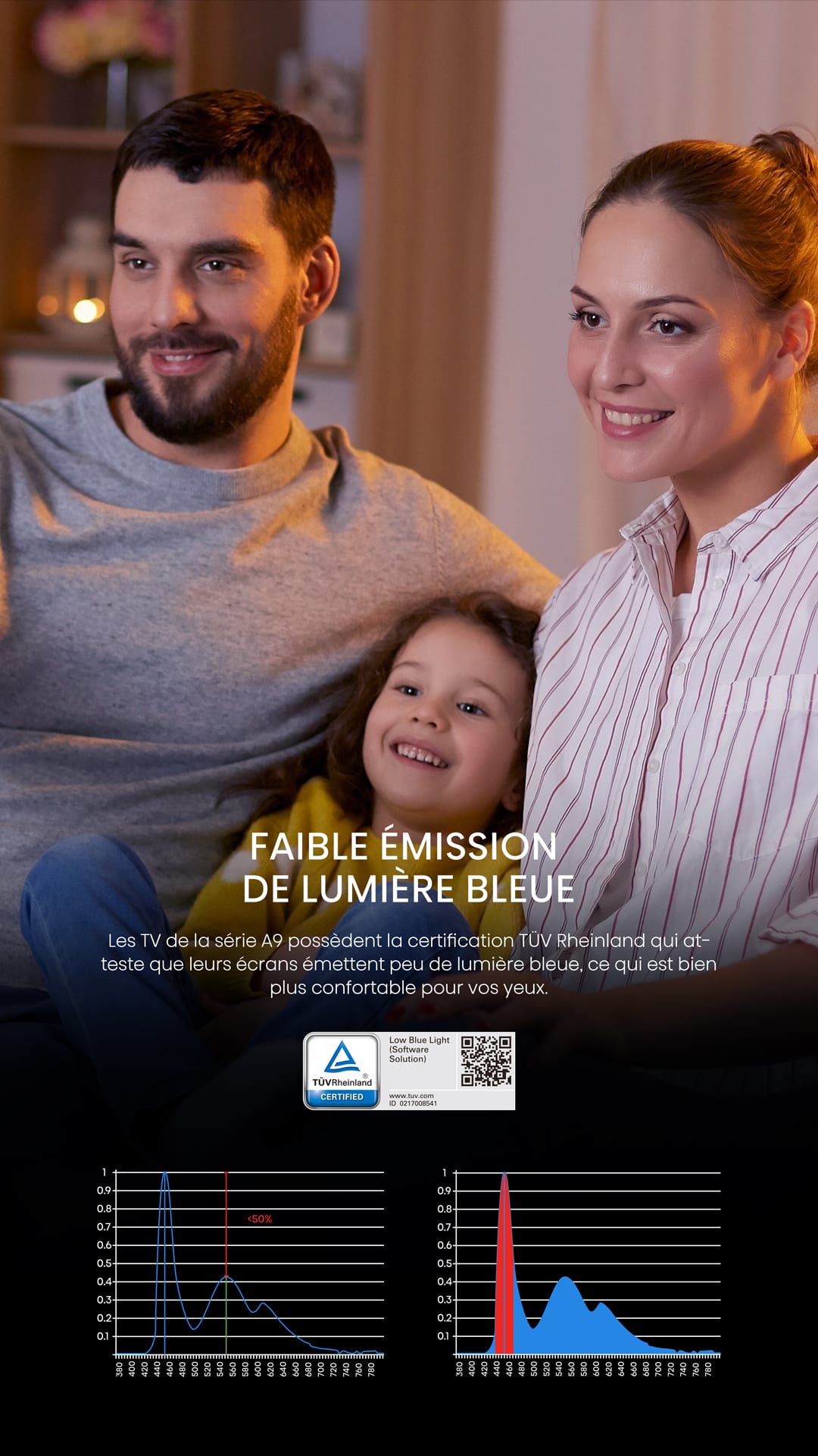 Les TV de la série A9 possèdent la certification TÜV Rheinland qui atteste que leurs écrans émettent peu de lumière bleue, ce qui est bien plus confortable pour vos yeux.