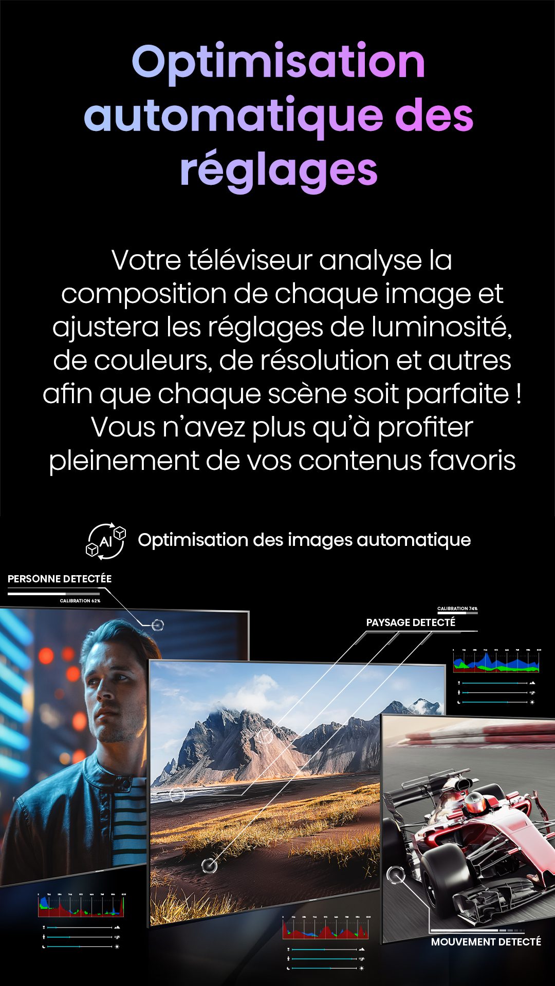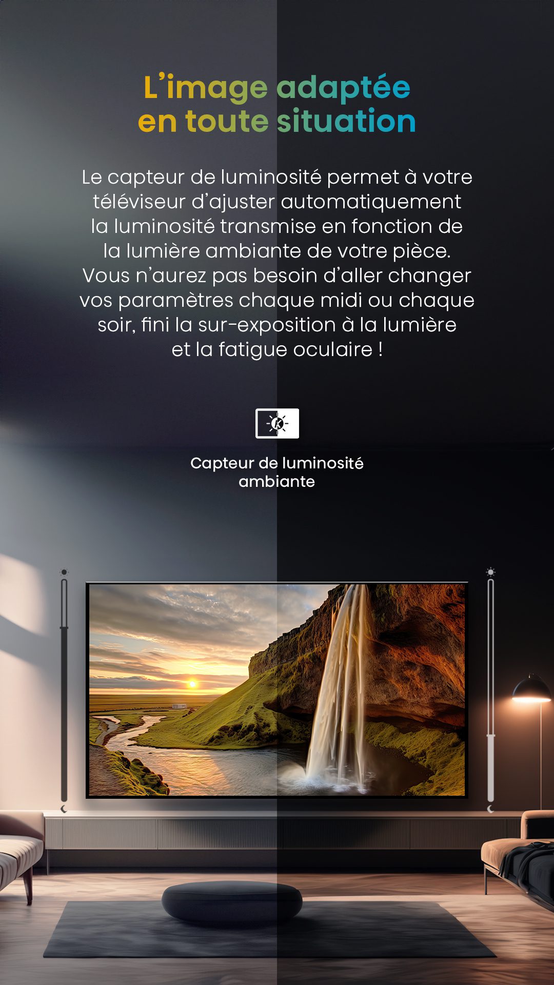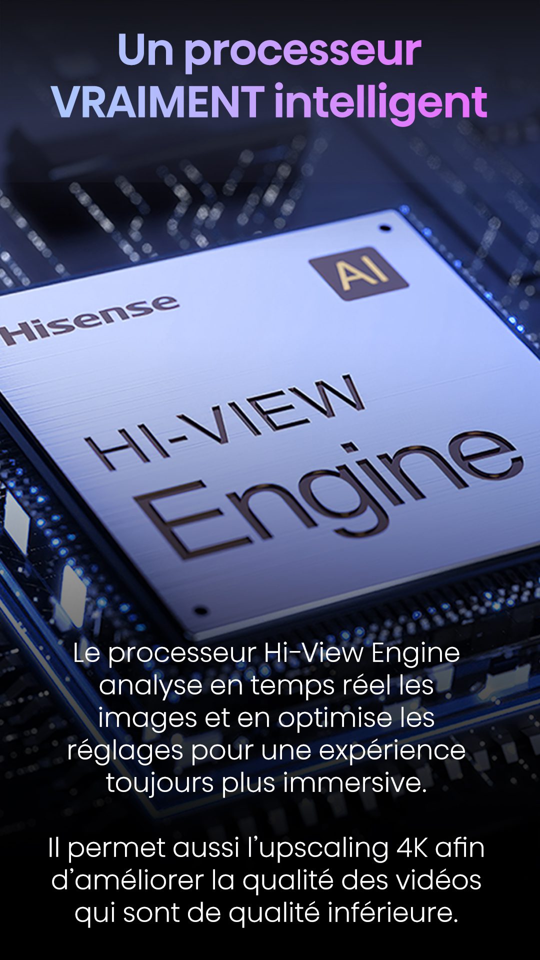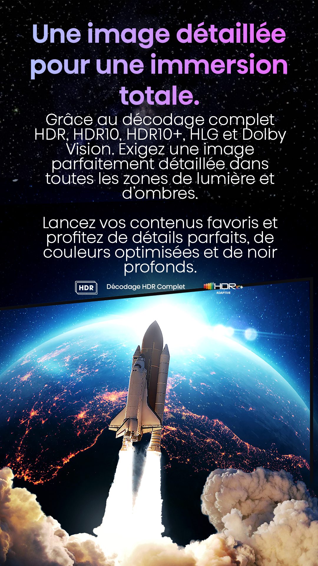 Optimisée pour chaque scène et chaque écran, cette technologie HDR (High Dynamic Range) vous offre des couleurs et des contrastes d’une subtilité incroyable et d’une qualité irréprochable sur pour l’ensemble de vos divertissements.